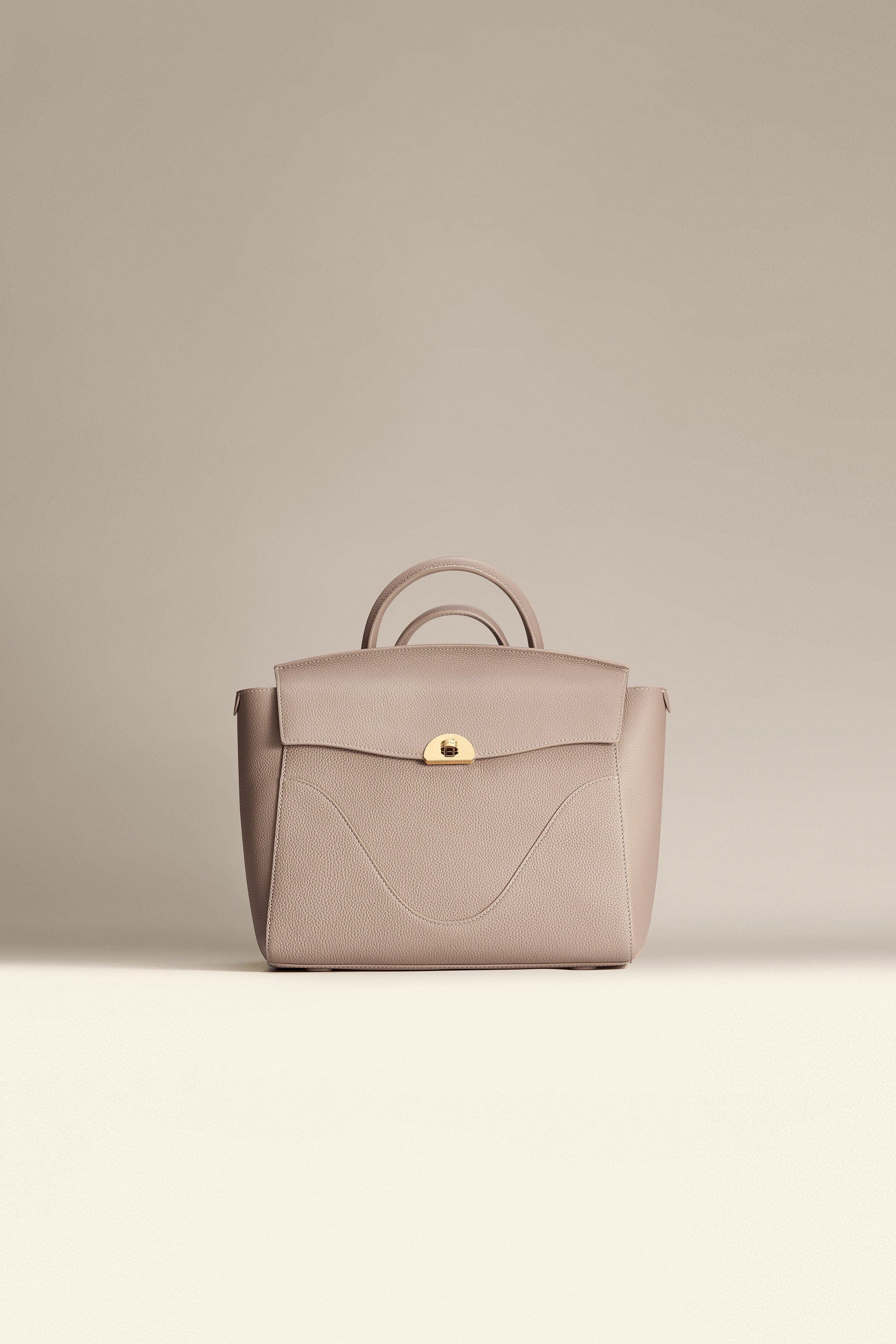The beige leather, gold-tone clasp, and structured design make it effortlessly chic, while the spacious interior keeps it functional.